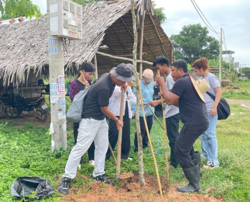 On February 29, 2024, the Trees for Life project delivered its first batch of trees to the village of Ta Ek. 450 trees were planted in Bloc M, the most critical area near the school. These trees will provide much-needed shade and shelter for children in this open and exposed location. In collaboration with villagers, some trees were also planted around houses and streets. Interviews with villagers helped determine the types of trees needed, resulting in a diverse selection including 20 different varieties, some of which are fruit trees.